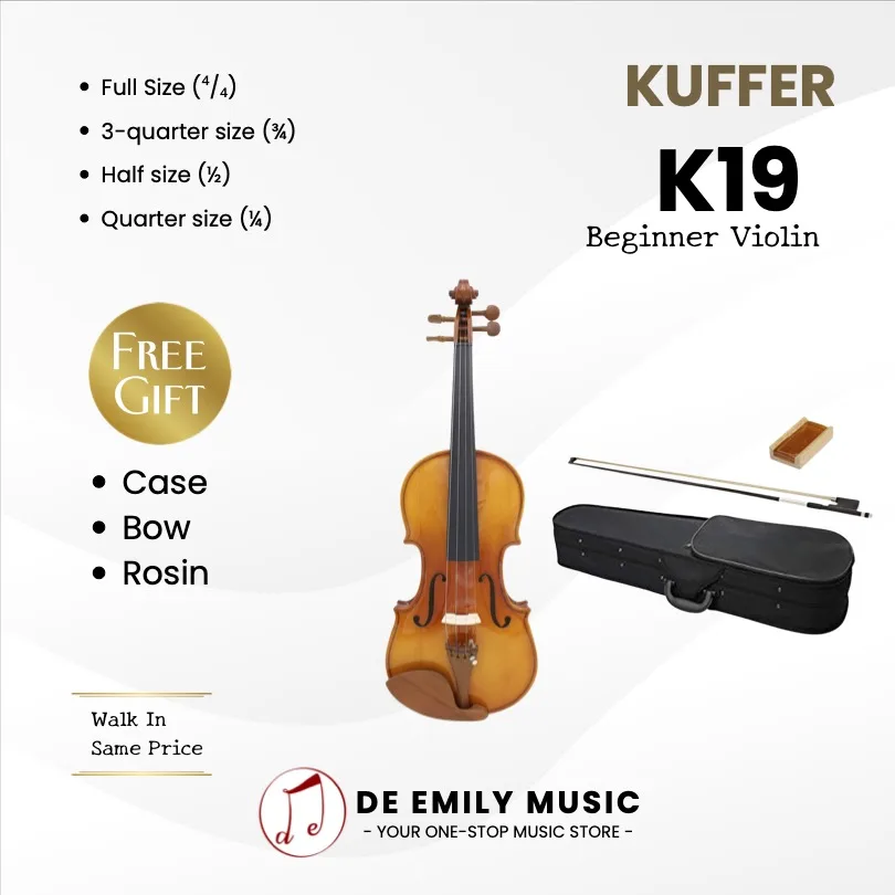 Kuffer K19 1/4 1/2 3/4 4/4 Size Beginner Violin comes with Case and accessories